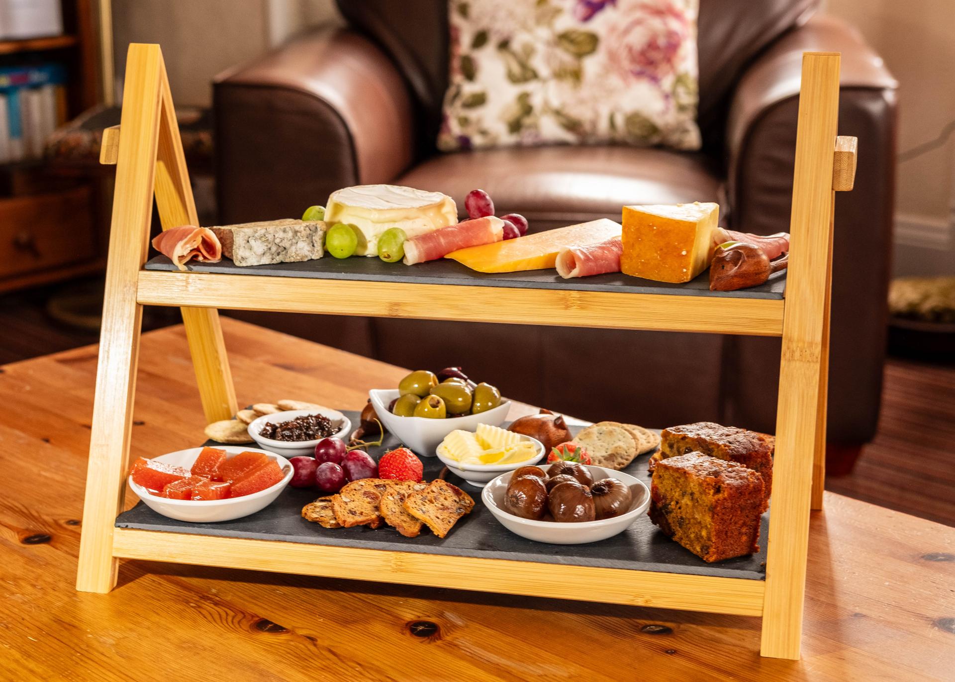 Why not treat yourself to our new Deluxe Cheeseboard. If you're a cheese lover this is for you,with a selection of 4 local Cumbrian cheeses, Cumbria Air Dried Ham,a selection of biscuits, olives, pickles, fruit cake etc. this truly is a mouthwatering treat. We serve tea or coffee with the cheeseboard but upgrades are available to include wine, prosecco or port.